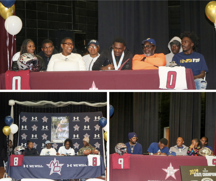 For most small rural high school football programs, such as Madison County High School (MCHS), if one athlete signs to play college football at the Division One level, that can be considered a big deal. Sometimes, a team may have two players signing at that level. To have three players from the same team to sign to play at the highest level is incredibly rare. That is exactly what happened in the MCHS gymnasium on Wednesday, Dec. 3, when three Cowboys sig