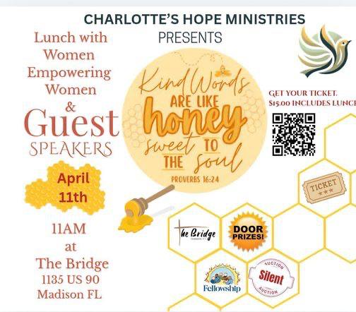 Coming off a successful women’s conference in January, where 80 women attended, Charlotte’s Hope Ministries is hosting a ladies luncheon at The Bridge, at 11 a.m., on Saturday, April 11 Entitled “Kind Words are Like Honey: Sweet to the Soul,” the luncheon will feature three speakers: Liz King, Sue Foust and Gricelle Gonzalez.