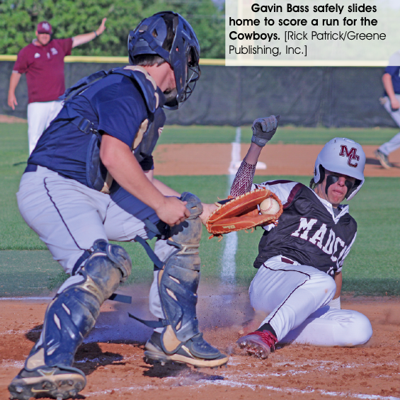 On Monday, April 4, the Madison County High School (MCHS) Cowboys varsity baseball team hosted the Hornets of Pelham High School, from north of the border, in Pelham, Ga. The Cowboys combined some great pitching from Parker Copeland and good production at the plate to shut out the Hornets, 10-0, in five innings.