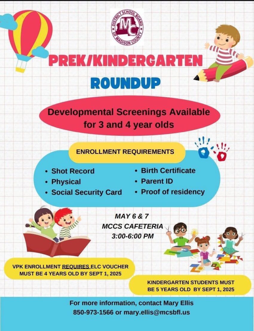 The District School Board of Madison County will be holding a PreK/Kindergarten roundup on Tuesday, May 6, and Wednesday, May 7, from 3 p.m. until 6 p.m. in the Madison County Central School cafeteria.