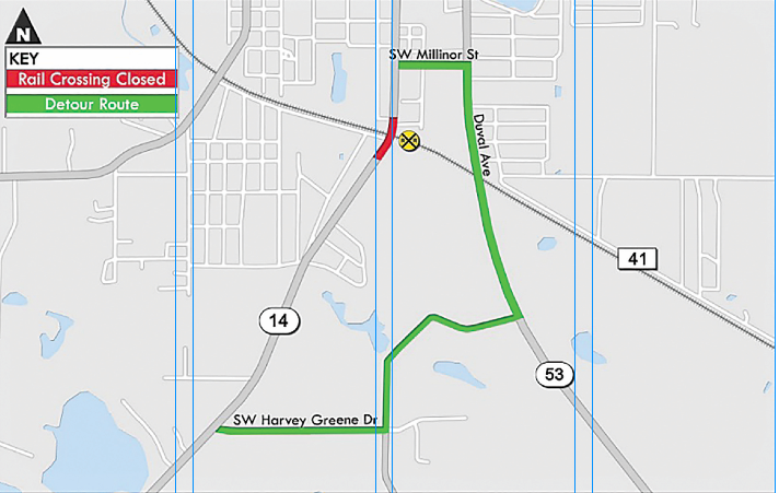 State Road 14 will be closed at the railroad crossing throughout the duration of the work. Drivers will use Millinor Street and Harvey Green Drive to connect with State Road 53 (Duval Avenue) to reach their destinations. (See map below.)