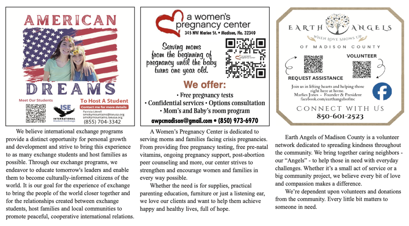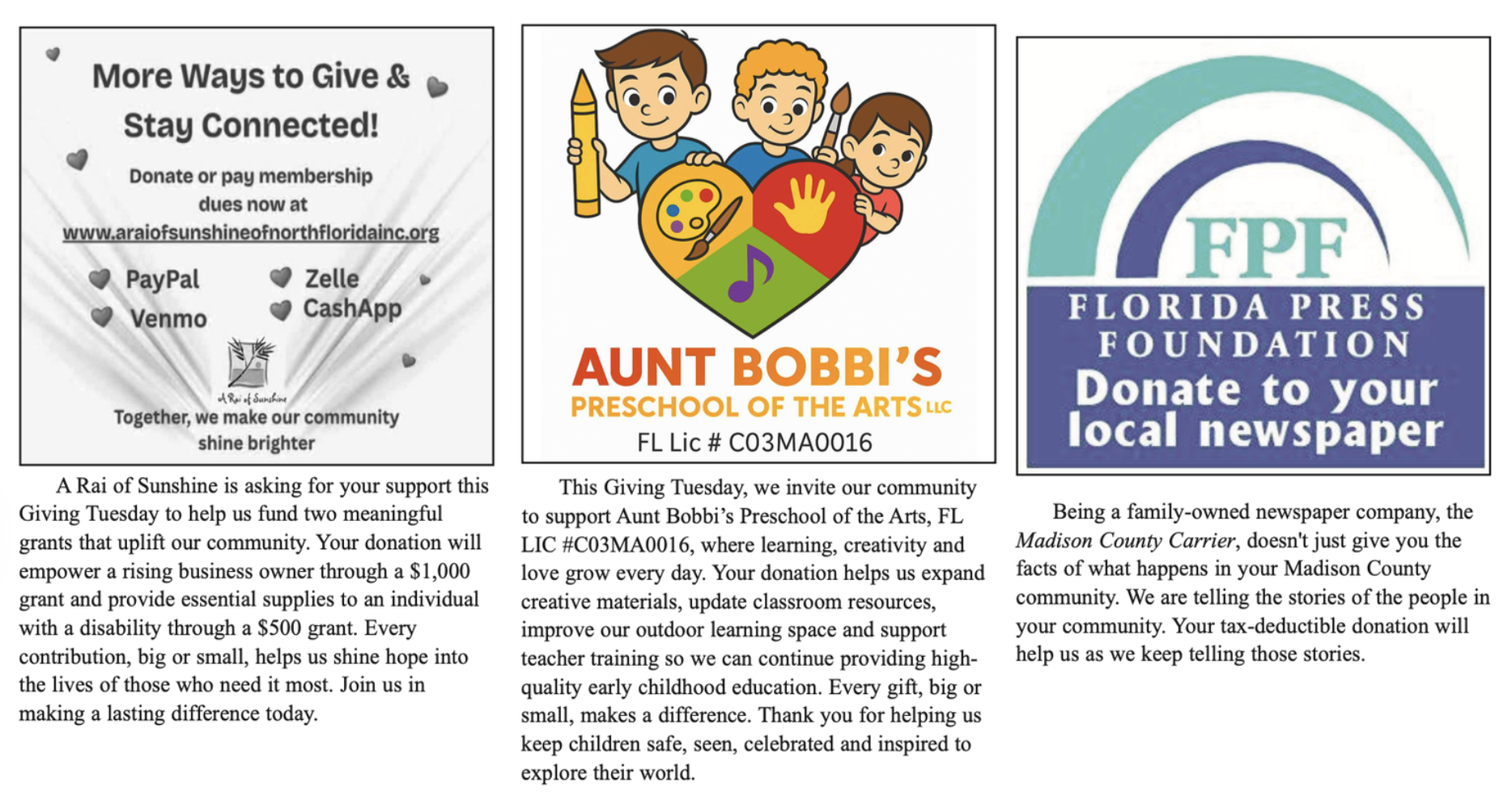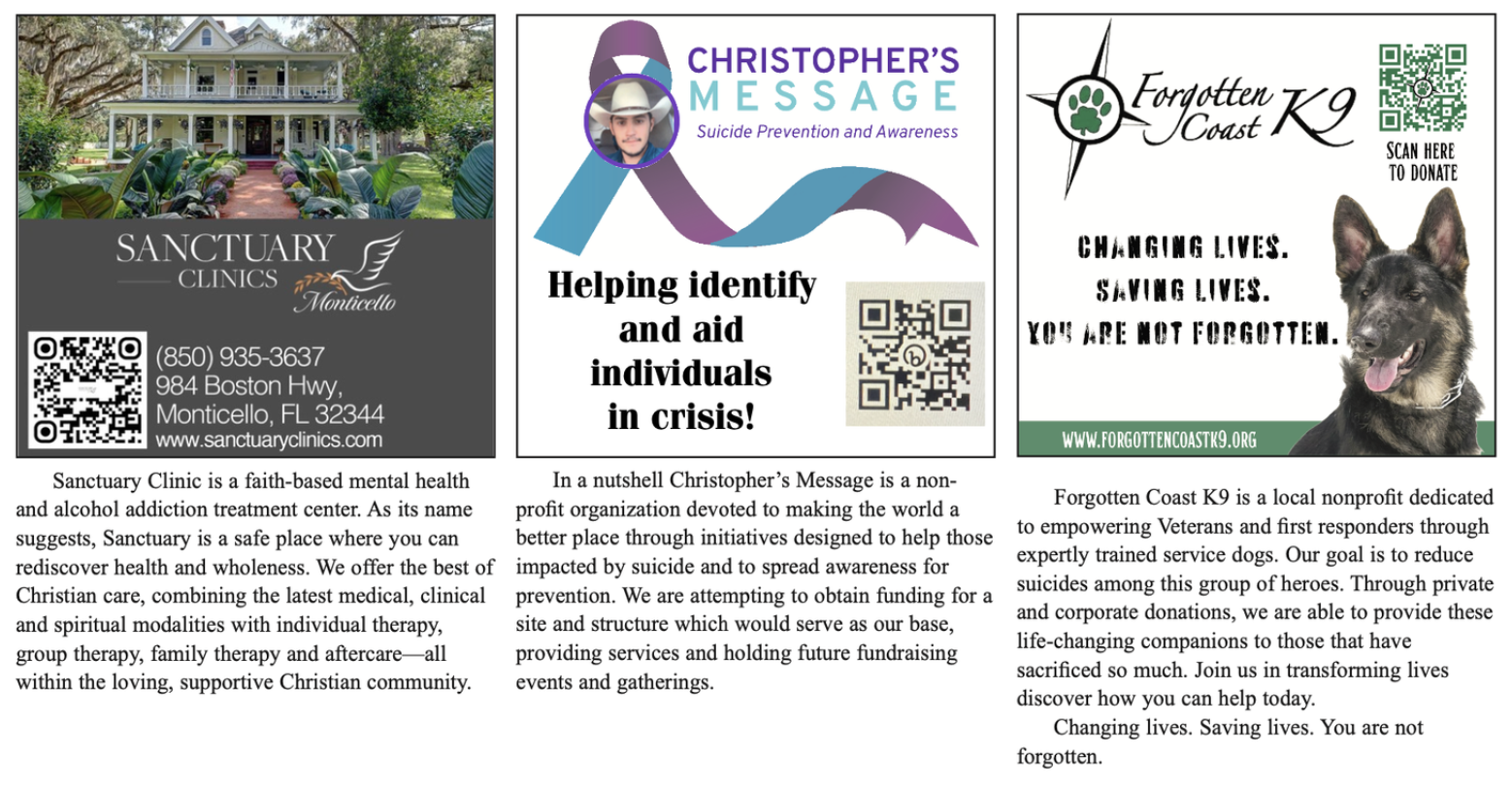 Madison County is home to several nonprofits that support local residents year-round, including the Suwannee Valley Humane Society, the Madison County Foundation for Excellence in Education, Boyz to Kings, Kiwanis Club of Madison, Madison Rotary Club, Madison Lions Club and many more. These organizations rely heavily on community donations to continue their work. Outside of Madison, groups such as the United Way, Habitat for Humanity, The American Red Cross and Feeding America also welcome year-end donations that help sustain services nationwide.
