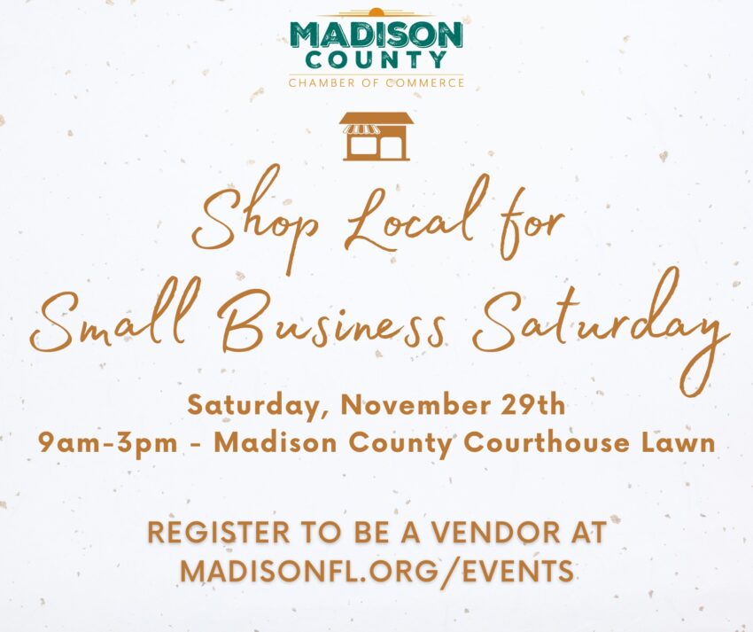 The Madison County Chamber of Commerce invites the community to join in celebrating Small Business Saturday with a Local Market on Saturday, Nov. 29, from 9 a.m. to 3 p.m. in beautiful downtown Madison.