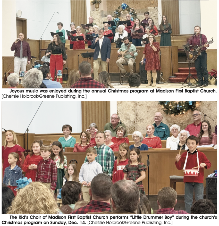 Sounds of the season filled the air on Sunday, Dec. 14, as Madison First Baptist Church presented their annual Christmas music program. The evening included musical numbers performed by the Choir Ensemble, the Youth Praise Band, the Sunday Praise Team, the Kid’s Choir as well as congregational singing. Holiday classics such as Little Drummer Boy, Go Tell it on the Mountain, What Child is This? and many more were on the program.