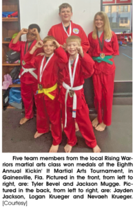 From the group of 11 Rising Warriors team members from Madison, five came home with medals in sparring competition. Jayden Jackson won first place in his age division. Logan Krueger took third place in his category. Nevaeh Krueger won first place in her division. Tyler Bevel won second place in his age category. Jackson Mugge took third place in his age division.