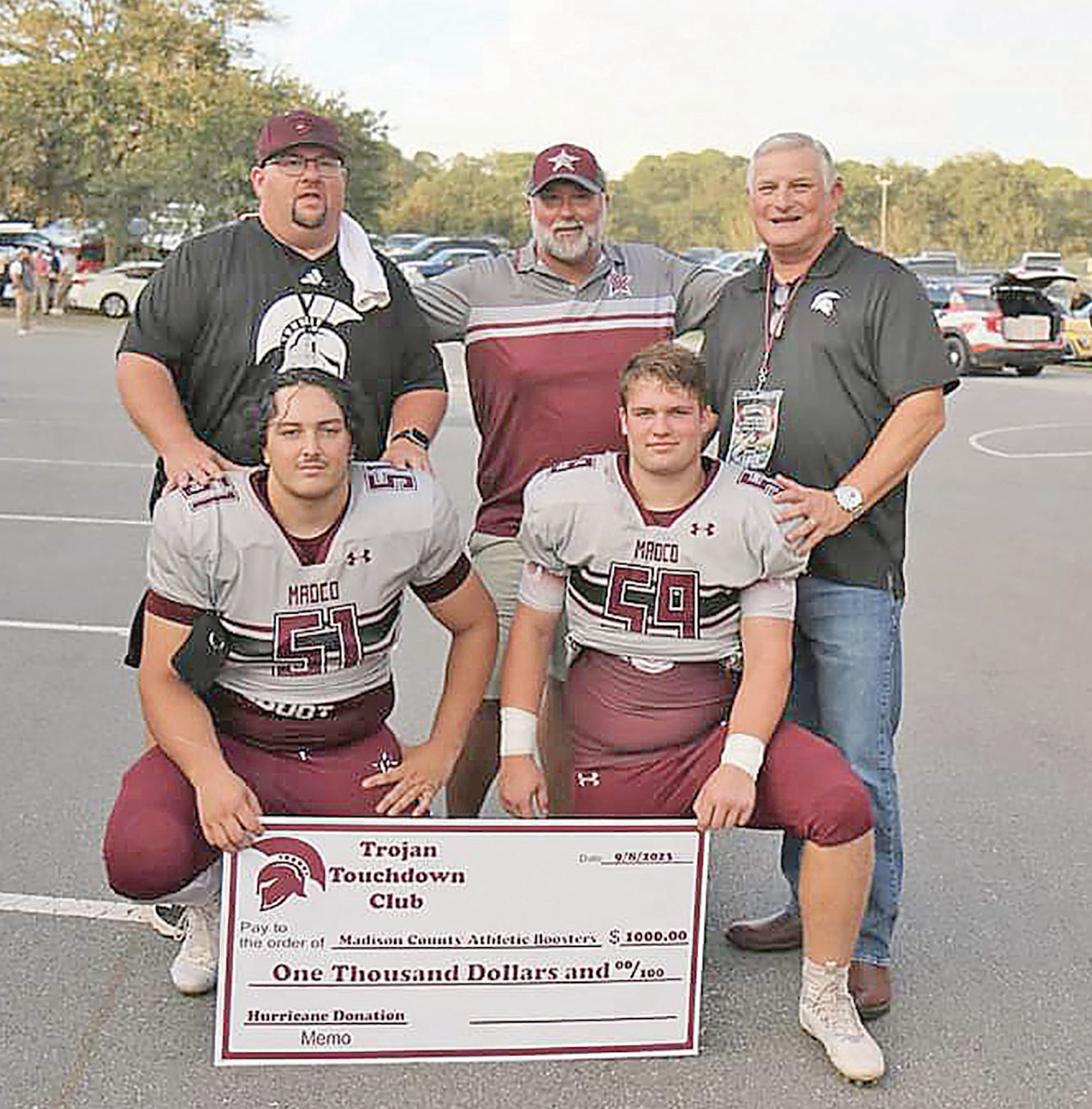 Former Madison County High School (MCHS) Head Football Coach Mike Coe recently helped the MCHS Athletic Boosters receive generous donations from the Trojan Touchdown Club in Coffee County High School, where Coach Coe is now the head football coach and from his church, GracePoint Church. Both the church and the Trojan Touchdown Club made generous contributions to the Madison County organization to “help them get back on their feet after the hurrica