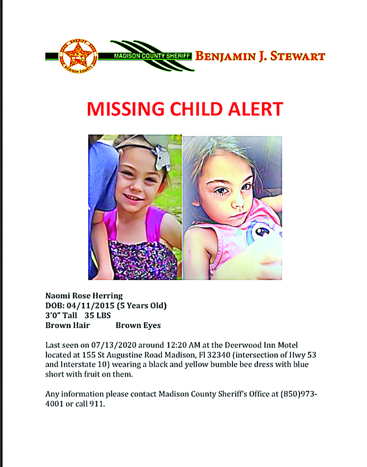 MCSO's Major David Harper reports that deputies were dispatched to the Deerwood Inn, located at 155 St. Augustine Rd., in Madison, near the I-10/SR 53 interchange in the early morning hours of Monday, July 13, in response to a report of a missing child. Upon arrival, deputies were informed that five-year-old Naomi Herring was last seen asleep in one of the motel rooms at approximately 12:30 a.m. Another child was said to be in the care of an adult male.