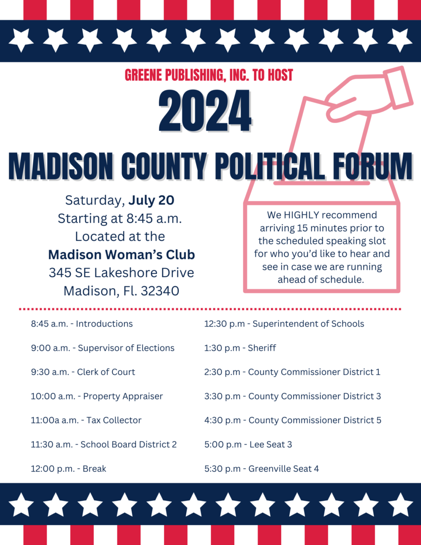 In an effort to help the voters of Madison County become more informed about the local candidates seeking political office, Greene Publishing, Inc. will be hosting a political forum. The forum will take place on Saturday, July 20, in the Woman’s Club Building, located at 345 Lakeshore Dr., in Madison. The event will feature many of the candidates running for local office and citizens will have an opportunity to meet with candidates one-on-one.